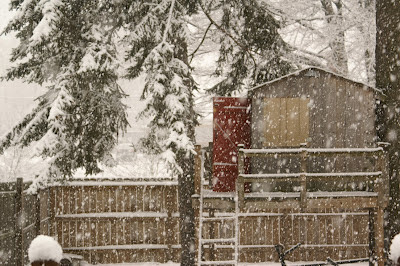 When we had our new fence put up, Jimmy (hubby) repurposed the wood into this treehouse. With the heavy snow falling today, I asked him to to get a pic of it.